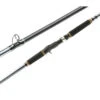 The full length, blank through butt, dual layer graphite and fiberglass construction delivers plenty of strength and power. The strong solid tip aids enormously in lifting big fish. Ergonomic fore grip shape helps control rod and line. Aluminum gimbal butt fits all fighting belts. Fully under wrapped heavy duty fixed guide frames protect highly polished aluminum oxide guides for smooth, wear free line flow. Stainless steel roller stripper and tip top guides on ”R” models provide smoother line flow and more fighting control. Corrosion proof machined aluminum reel seats with heavy duty machined hoods deliver greater strength without excess weight.