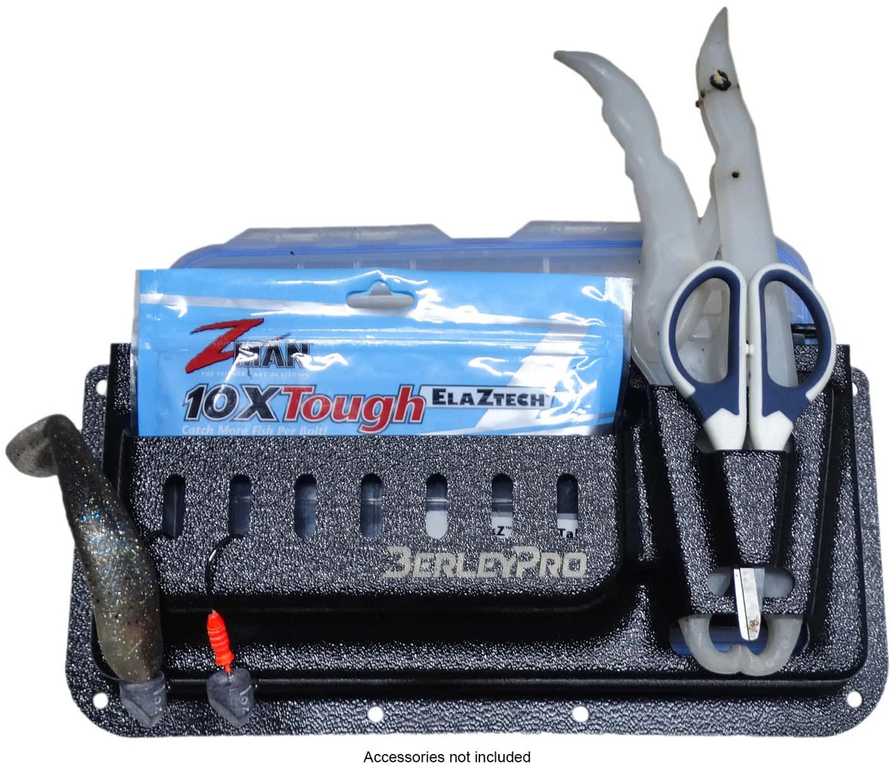 The BerleyPro Prison Pocket storage system is made of ABS plastic and will hold nearly anything. A large pocket holds tackle boxes at the rear and a smaller pocket on the front holds soft plastic pouches or smaller tackle trays. The slots on the front of the small pocket are used for hanging lures or jig heads. The two formed Vs on the side are made for holding scissors, pliers, and fish grips.