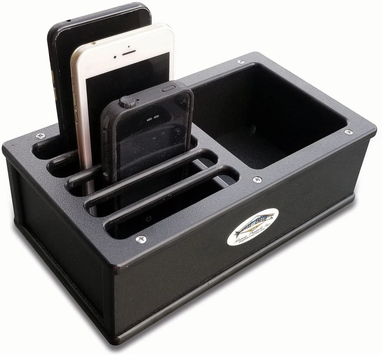 The Deep Blue Cell Phone Storage Box has five cell phone slots as well as a storage box for any other loose items, wallets, keys, sunscreen, etc. Made out of Starboard, so it won’t warp or fade from the sun. Can be mounted permanently or with suction cups (included). Lifetime warranty, Made in America, Tested on the water.