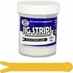 Fat Cow Jig Strips Split Tails are scented with squid oil. These strips feature fork tails and bright coloring for strike simulating action. The flat design helps to keep your lure suspended in the strike zone longer. The design of these strips helps to decrease the sink rate of your lure as well. To use, simply attach your lure of choice and fish as you normally would. These scented strips are perfect for surfcasting bucktails, jigging, trolling tubes, and umbrella rigs. The container fits in your pork rind holder.