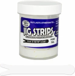 Fat Cow Jig Strips Split Tails are scented with squid oil. These strips feature fork tails and bright coloring for strike simulating action. The flat design helps to keep your lure suspended in the strike zone longer. The design of these strips helps to decrease the sink rate of your lure as well. To use, simply attach your lure of choice and fish as you normally would. These scented strips are perfect for surfcasting bucktails, jigging, trolling tubes, and umbrella rigs. The container fits in your pork rind holder.