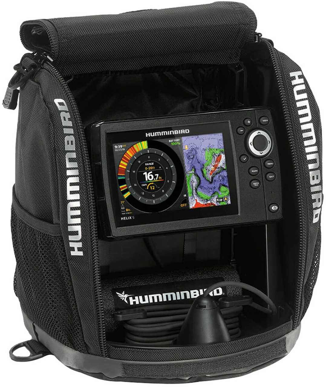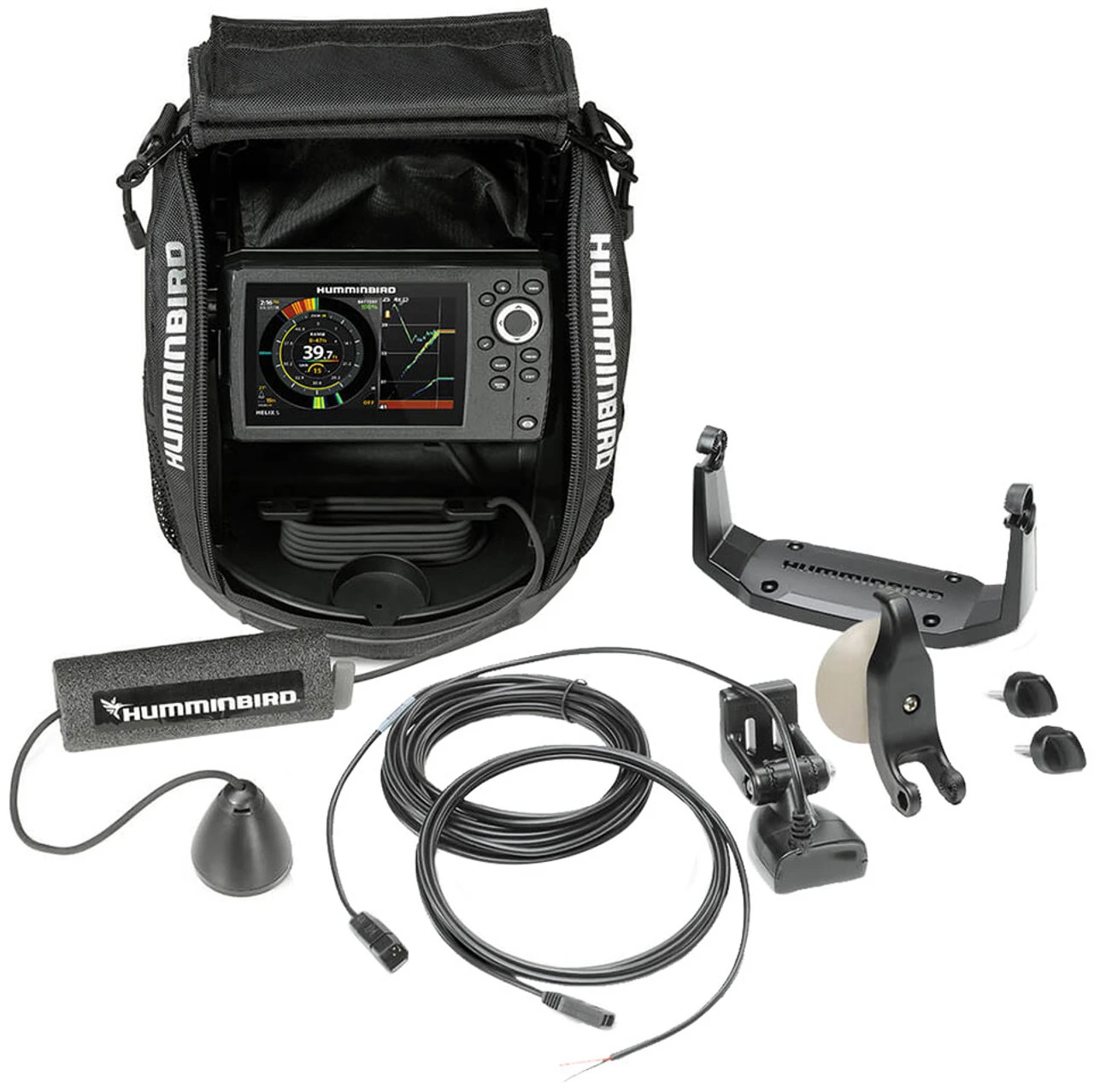 - What’s Included: ICE HELIX 5 CHIRP GPS G2 fish finder, Dual Spectrum CHIRP Ice transducer, 9 Amp Hour battery and charger, ice shuttle, hardware, power cable, portable bag and all necessary accessories to use on a boat or in portable applications (transom mount CHIRP transducer with optional suction cup transducer mount, fish finder gimbal mount and power cord).