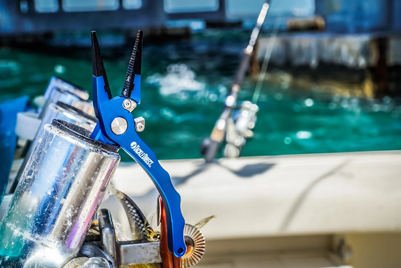 TackleDirect 7.5in Custom Offshore Pliers feature machine cut Aluminum handles for reduced weight. The tungsten carbide cutters are built specifically for braided line. The jaws are made of a coated carbon steel for strength and durability. The TackleDirect Pliers come with a cordura pouch and a heavy duty nylon lanyard, making it the ultimate value for the serious Saltwater Angler. These pliers also feature the TackleDirect Logo engraved in white.